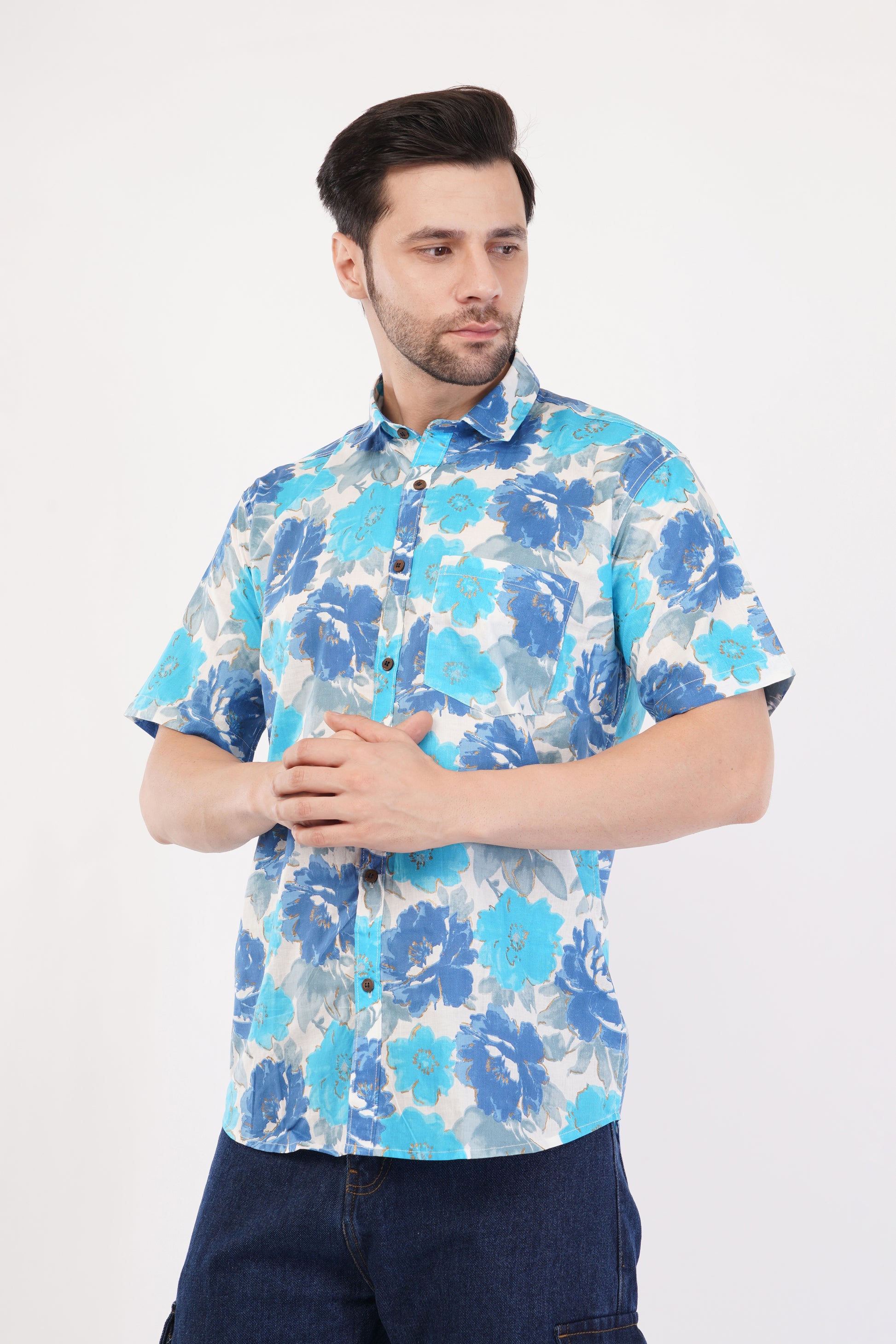 DISCOVER THE ESSENCE OF TRADITION AND STYLE WITH CLOVEIFY'S SANGANERI SHIRTS, METICULOUSLY HANDCRAFTED BY SKILLED ARTISANS FROM JAIPUR, RAJASTHAN. THIS 100% PURE COTTON BLUE SANGANERI SHIRT WITH BIG FLORAL PATTERN IS MADE FROM LIGHTWEIGHT 140 GSM COTTON, THESE SHIRTS FEATURE INTRICATE HAND-BLOCK PRINTS THAT CELEBRATE THE RICH HERITAGE OF SANGANERI CRAFTSMANSHIP.