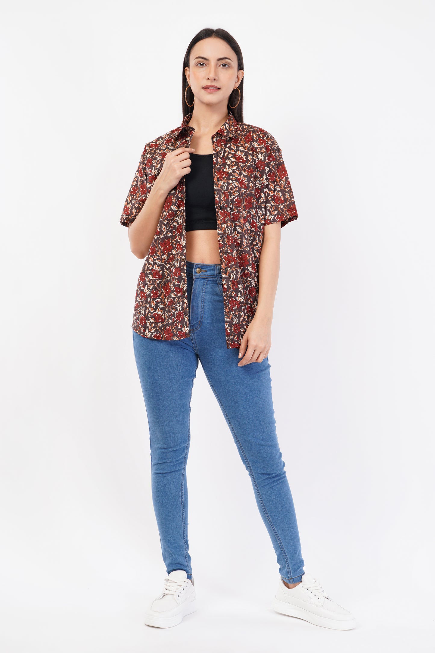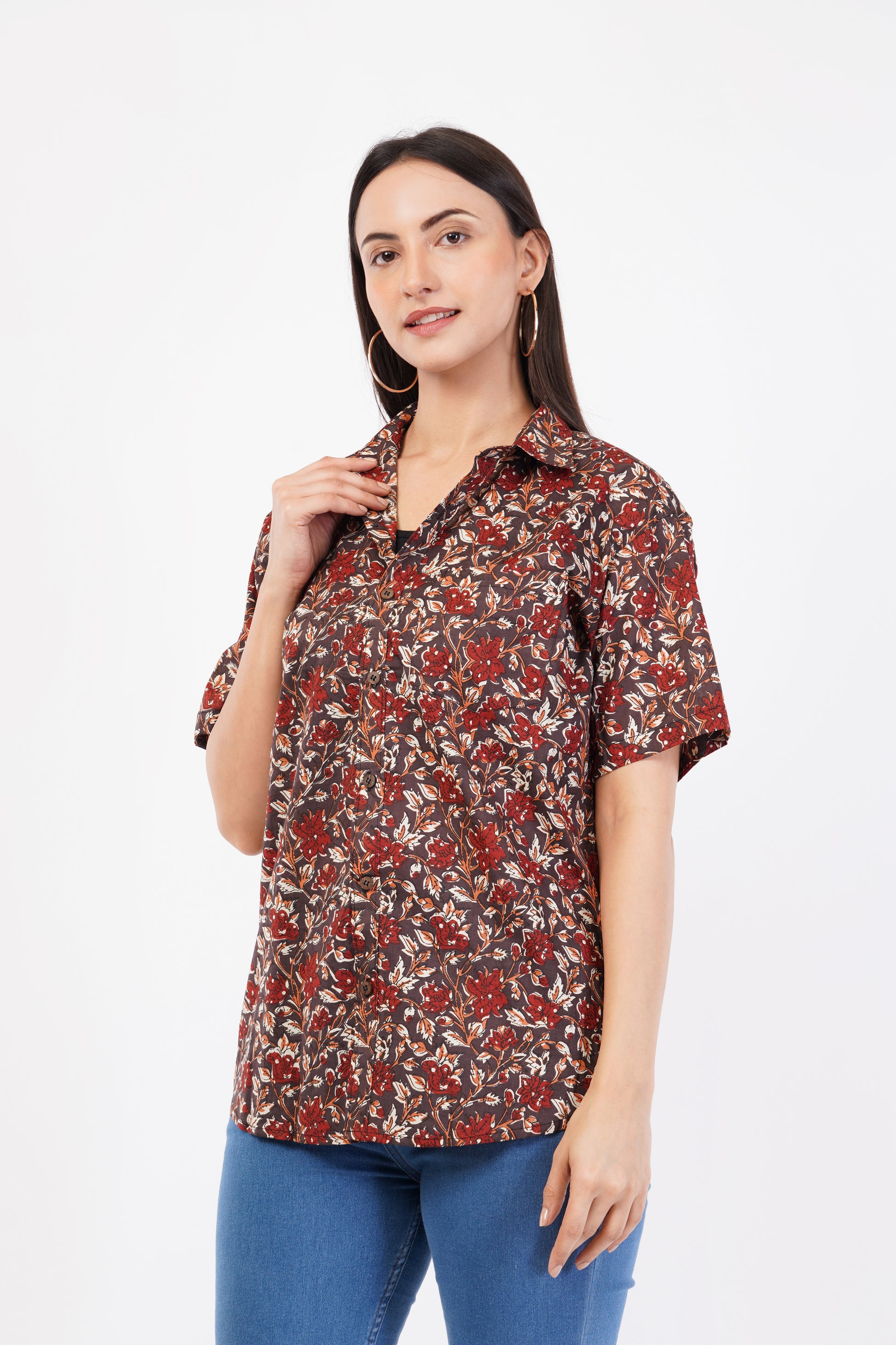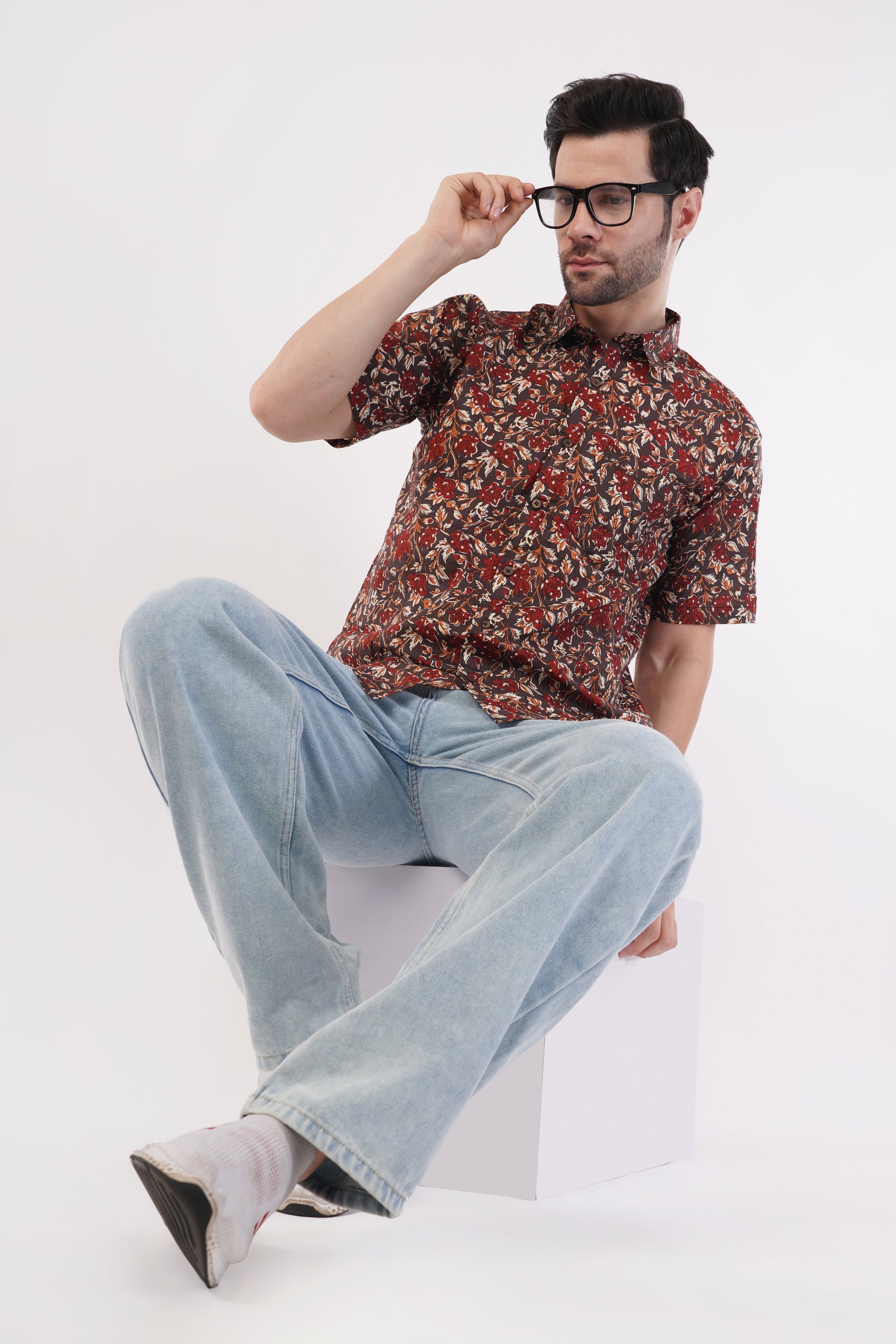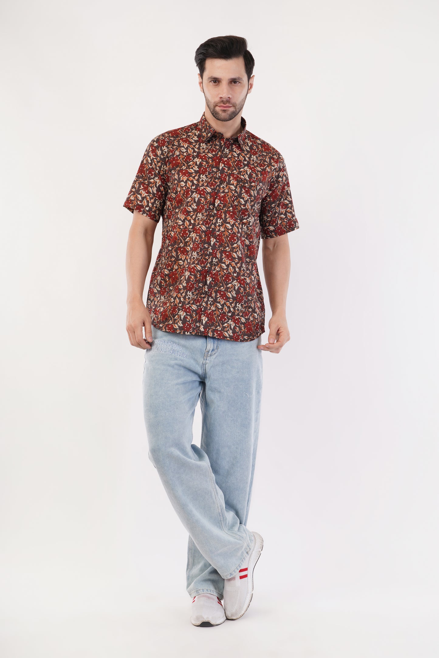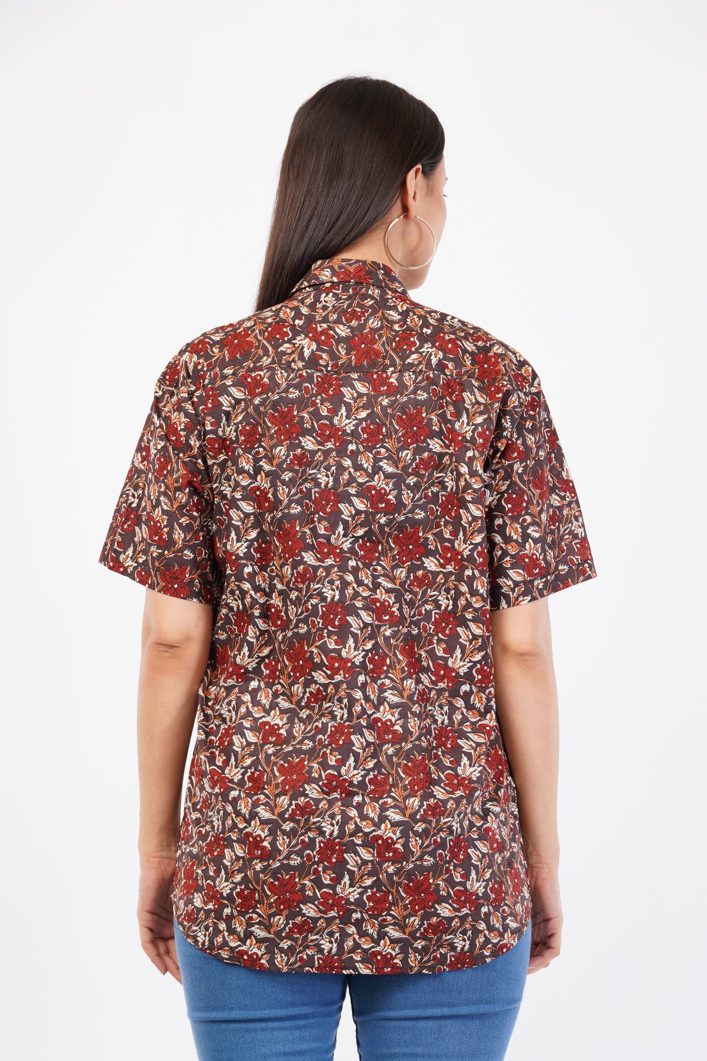 Unisex Brown Small Floral Pattern Sanganeri Shirt