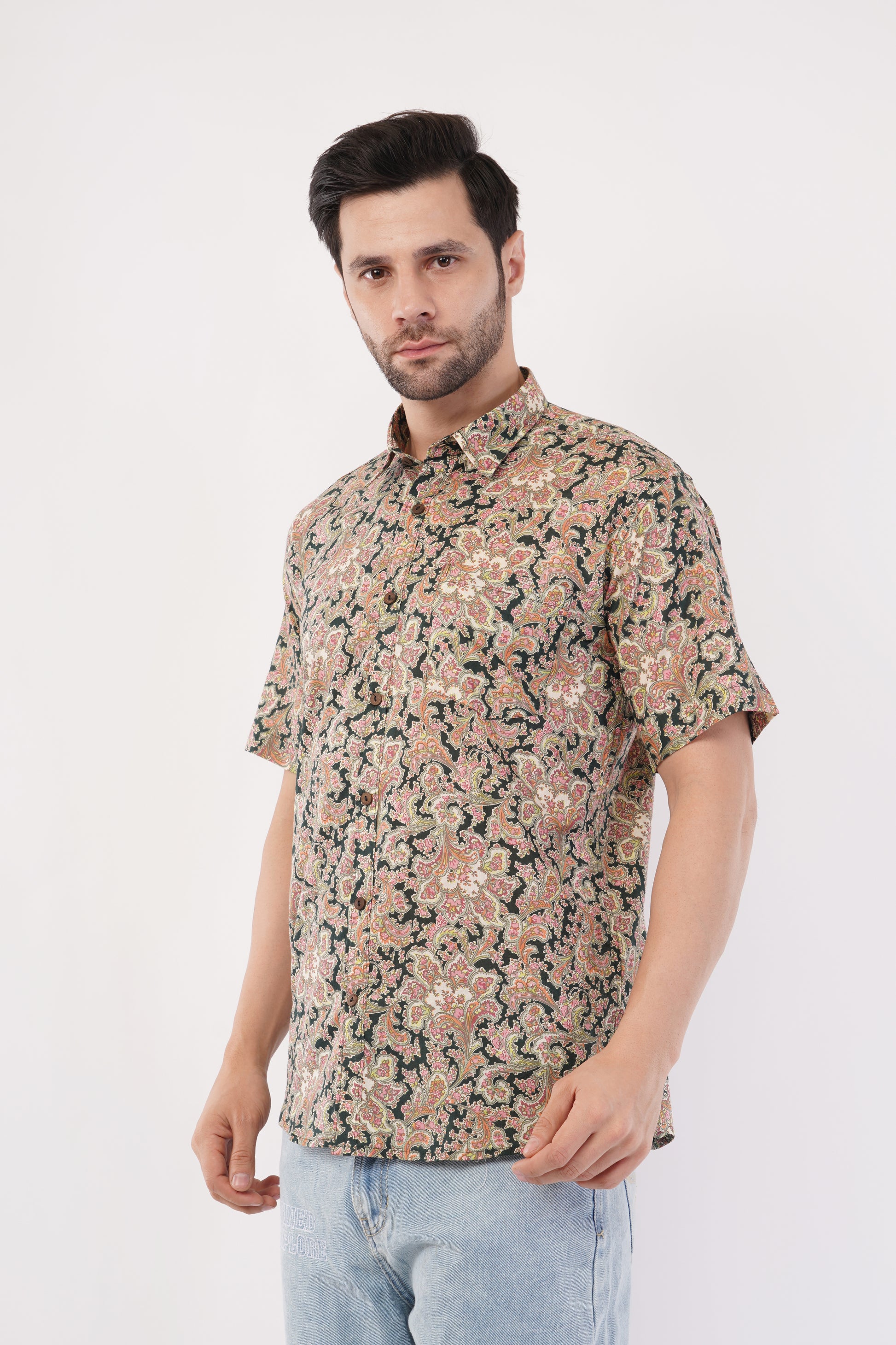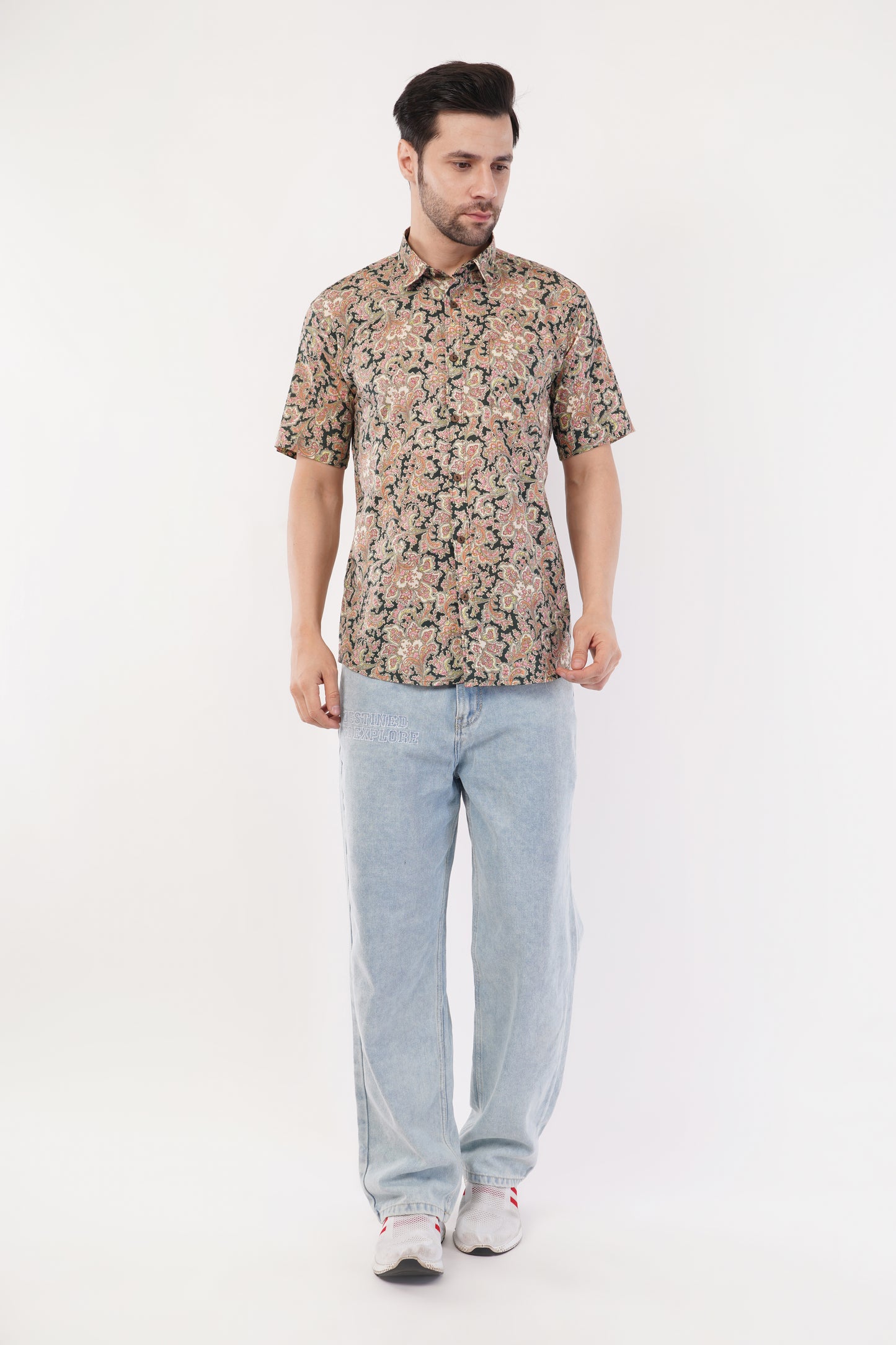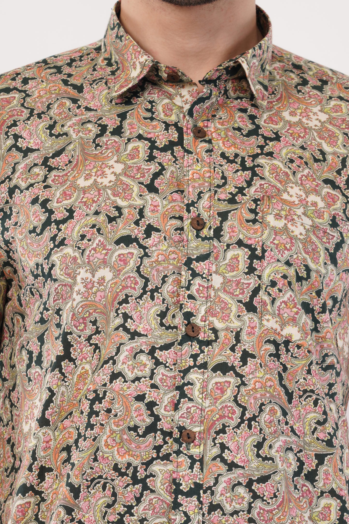 Unisex Dark Green Small Floral Pattern Sanganeri Shirt