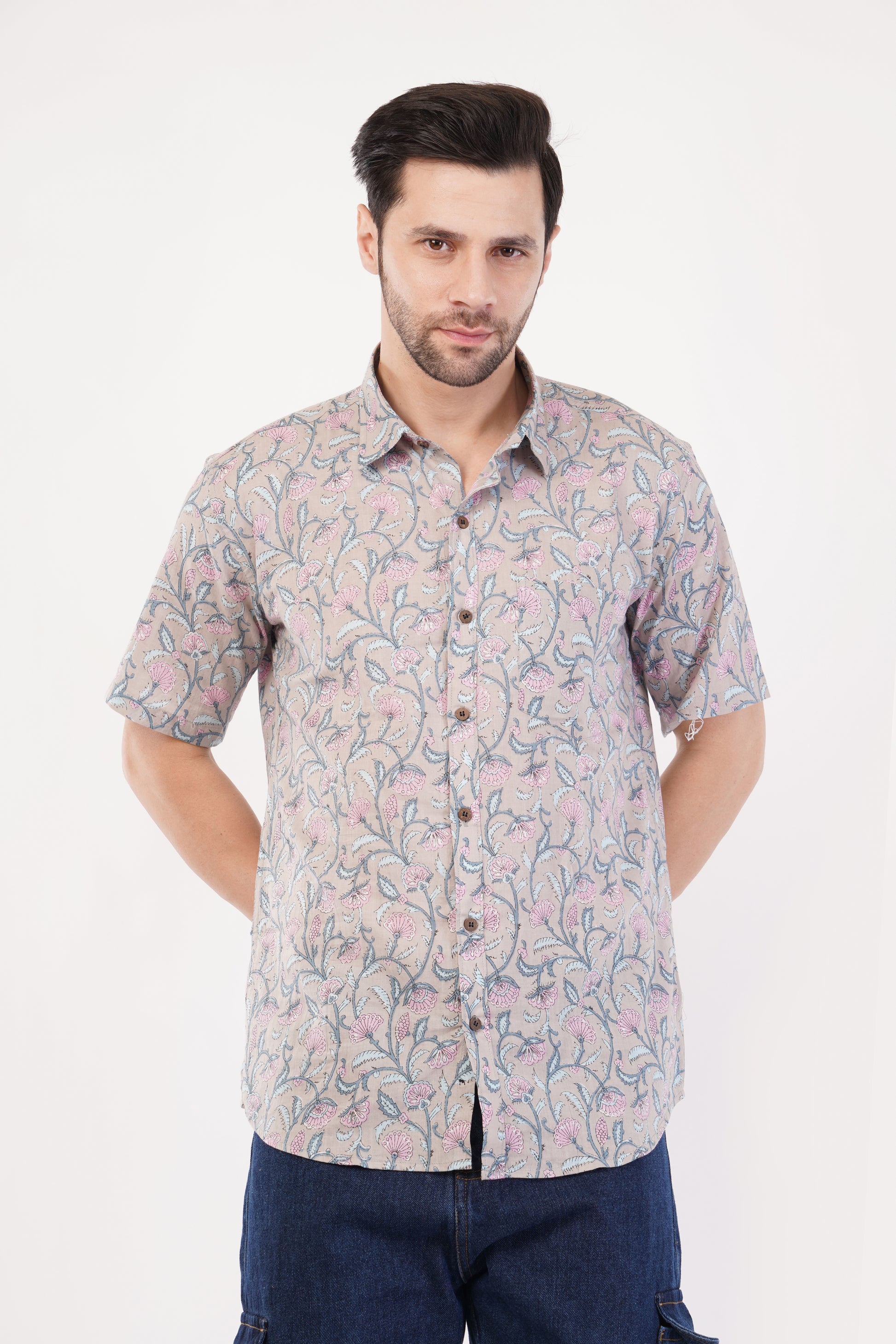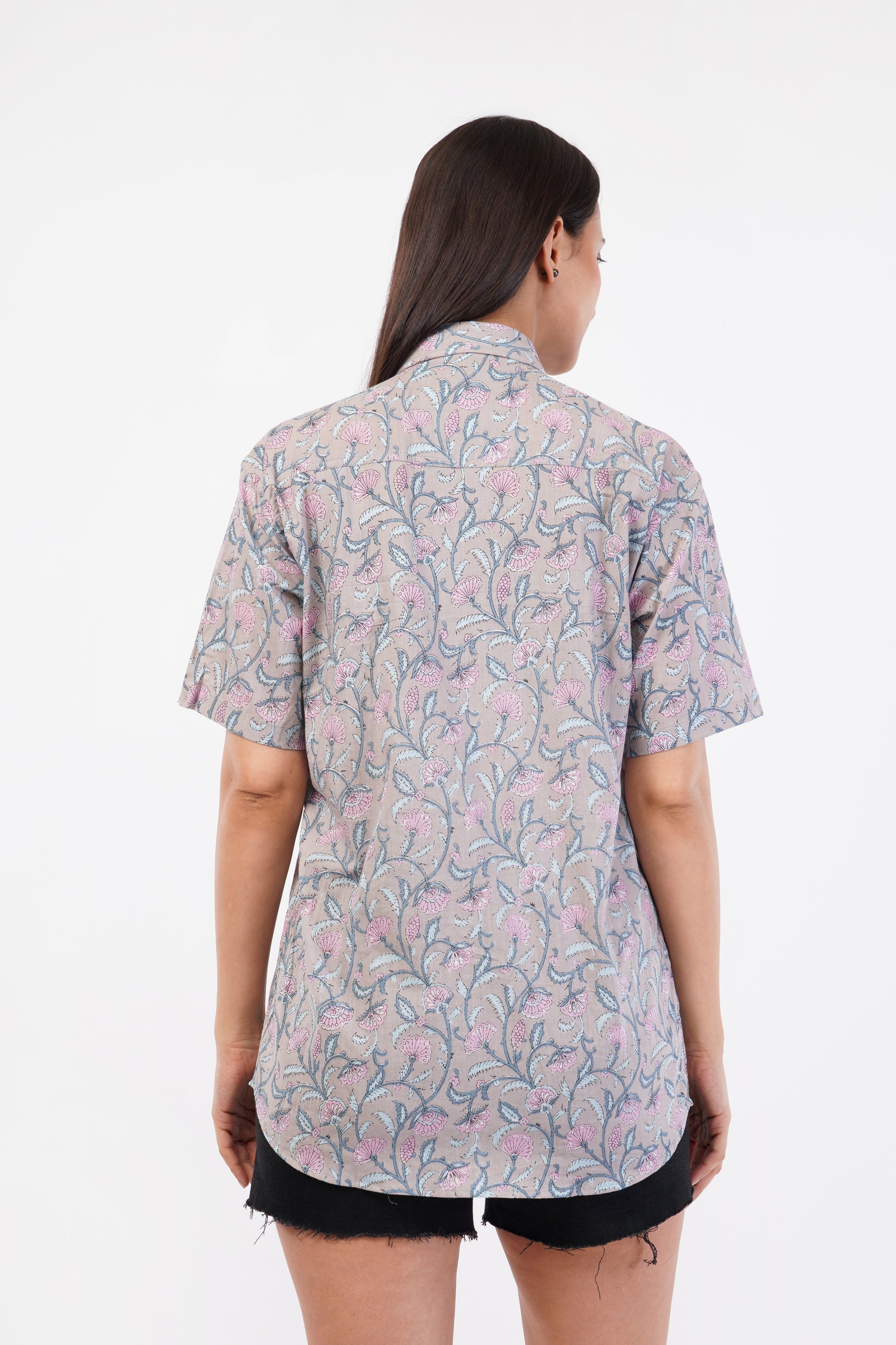DISCOVER THE ESSENCE OF TRADITION AND STYLE WITH CLOVEIFY'S SANGANERI SHIRTS, METICULOUSLY HANDCRAFTED BY SKILLED ARTISANS FROM JAIPUR, RAJASTHAN. THIS 100% PURE COTTON GREY SANGANERI SHIRT WITH SMALL PINK FLORAL PATTERN IS MADE FROM LIGHTWEIGHT 140 GSM COTTON, THESE SHIRTS FEATURE INTRICATE HAND-BLOCK PRINTS THAT CELEBRATE THE RICH HERITAGE OF SANGANERI CRAFTSMANSHIP.