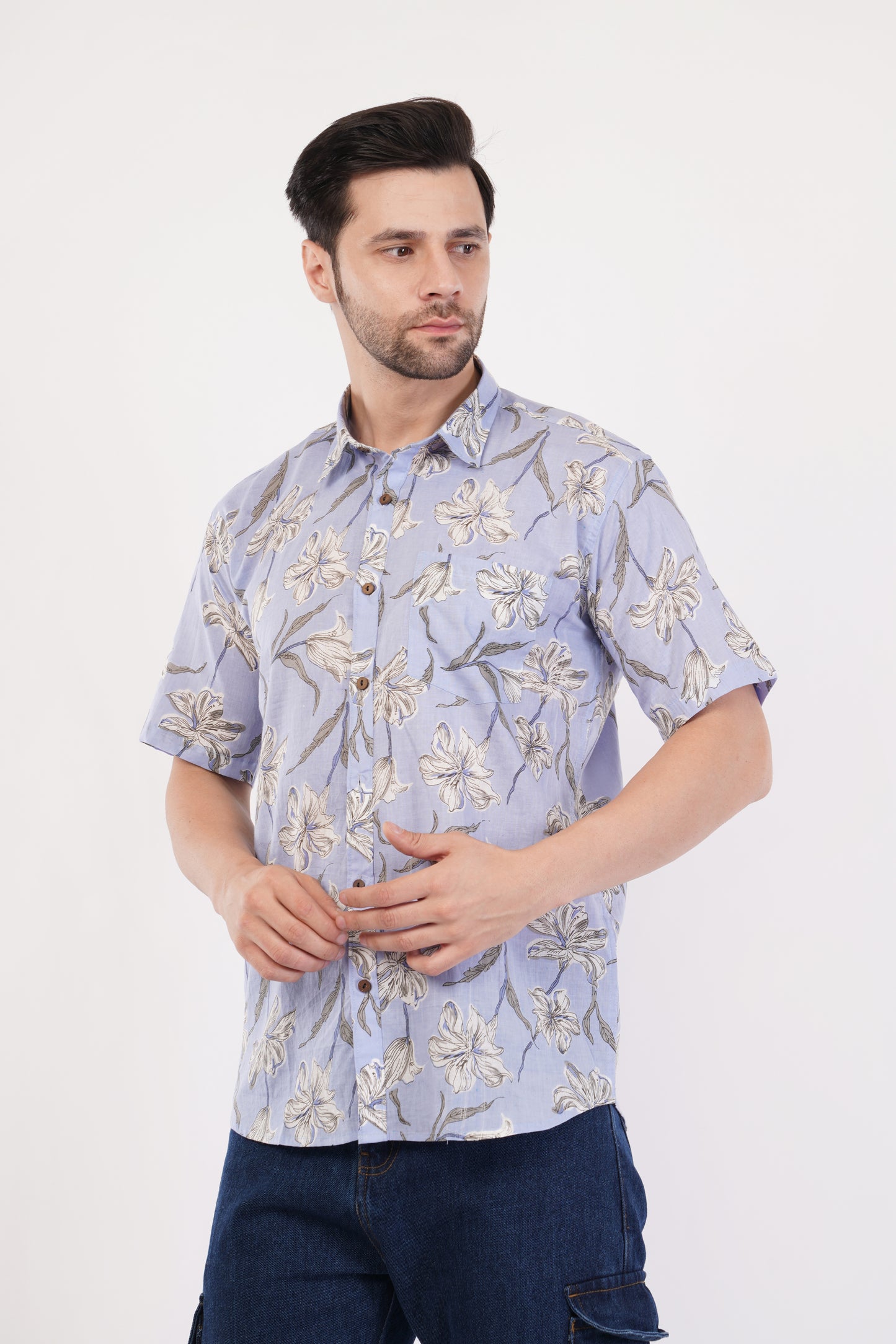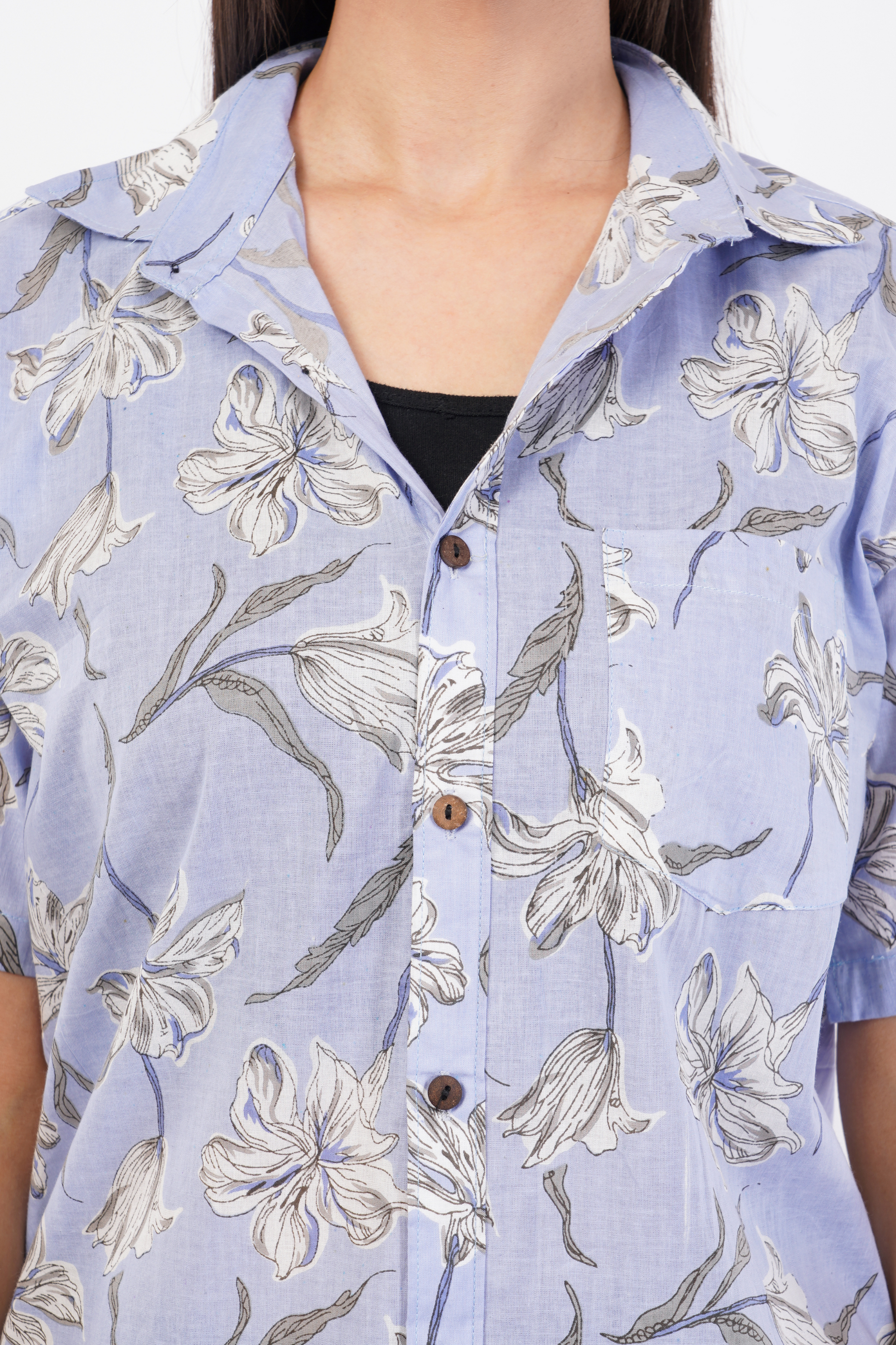 DISCOVER THE ESSENCE OF TRADITION AND STYLE WITH CLOVEIFY'S SANGANERI SHIRTS, METICULOUSLY HANDCRAFTED BY SKILLED ARTISANS FROM JAIPUR, RAJASTHAN. THIS 100% PURE COTTON LAVENDER SANGANERI SHIRT WITH BIG WHITE FLORAL PATTERN IS MADE FROM LIGHTWEIGHT 140 GSM COTTON, THESE SHIRTS FEATURE INTRICATE HAND-BLOCK PRINTS THAT CELEBRATE THE RICH HERITAGE OF SANGANERI CRAFTSMANSHIP.