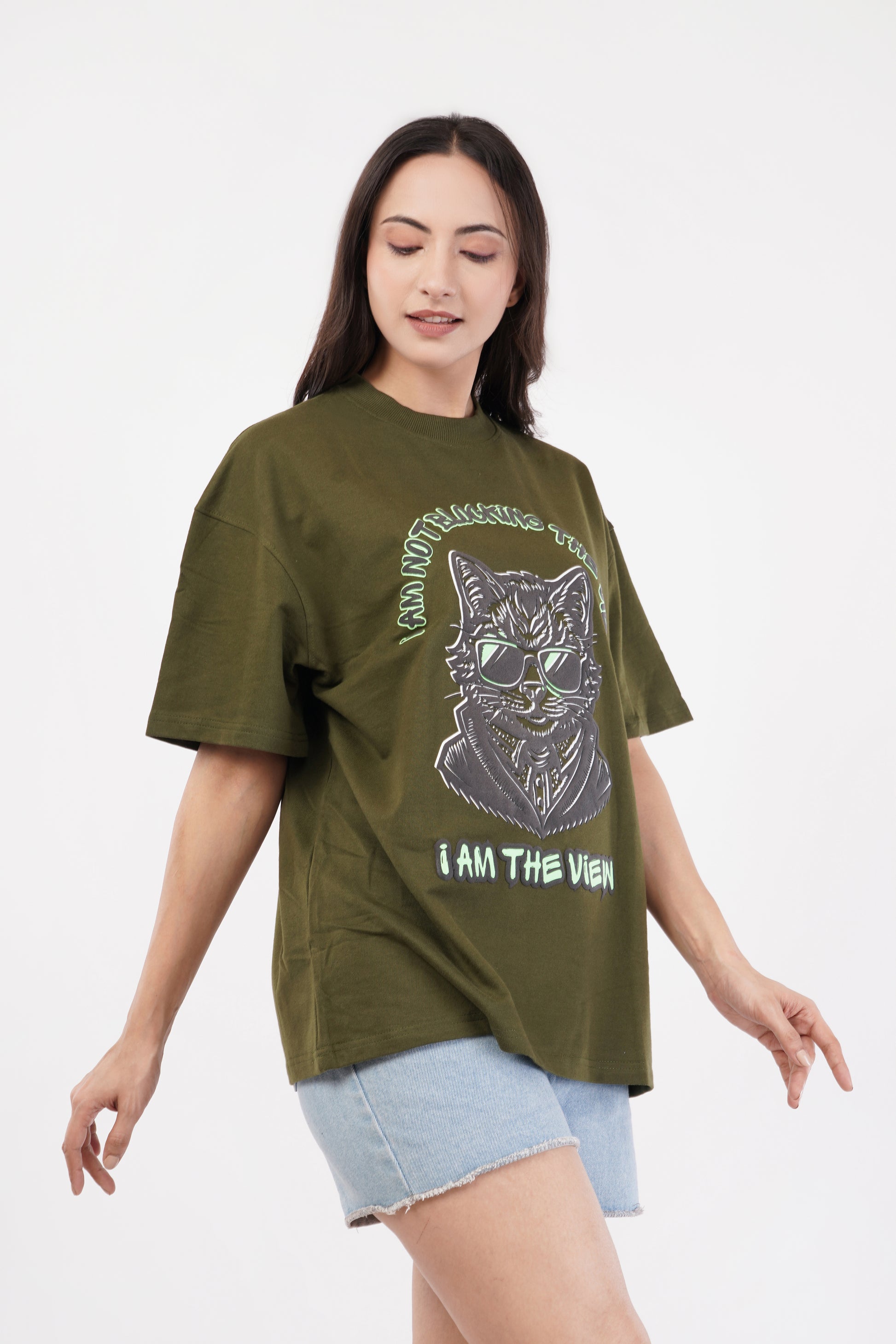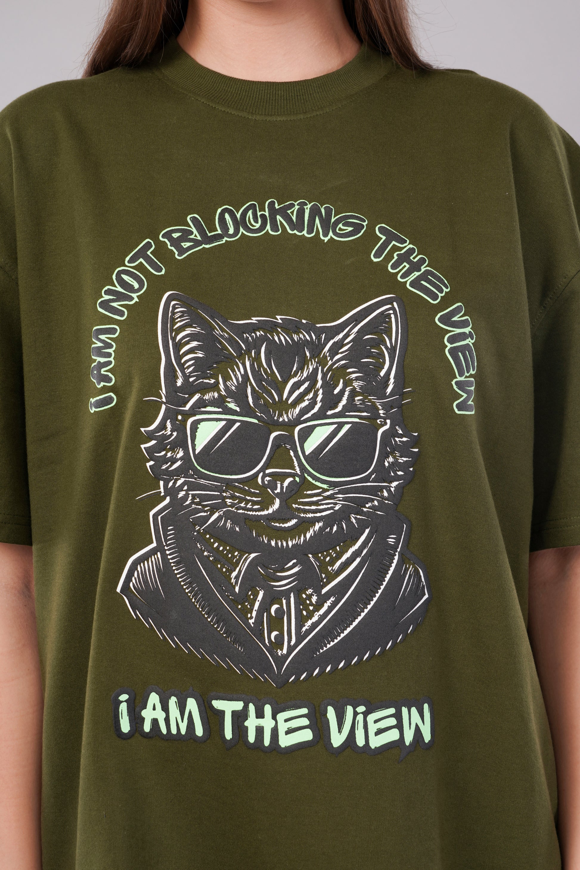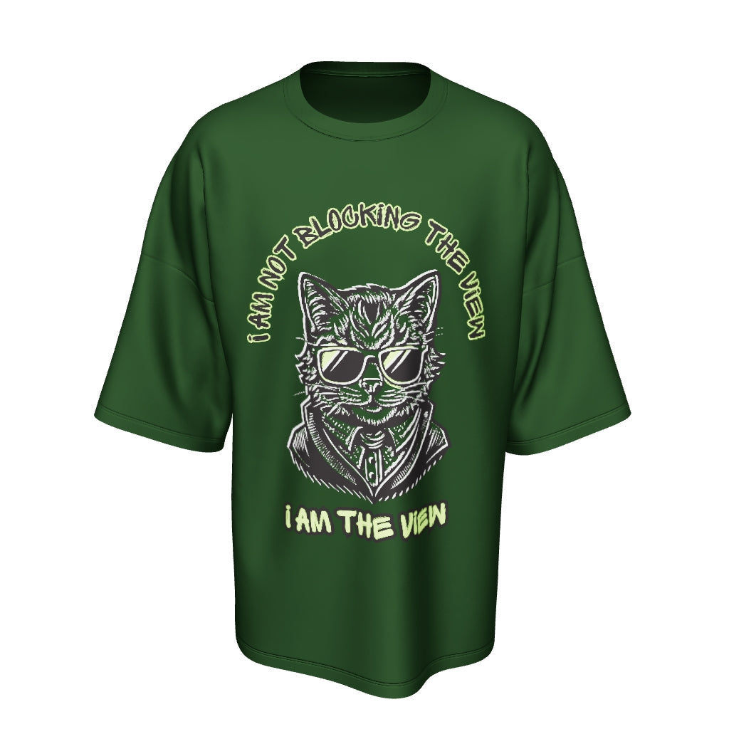 Unisex Puff Print "I am not blocking the view, I am the view" Olive Green Oversized T-Shirt