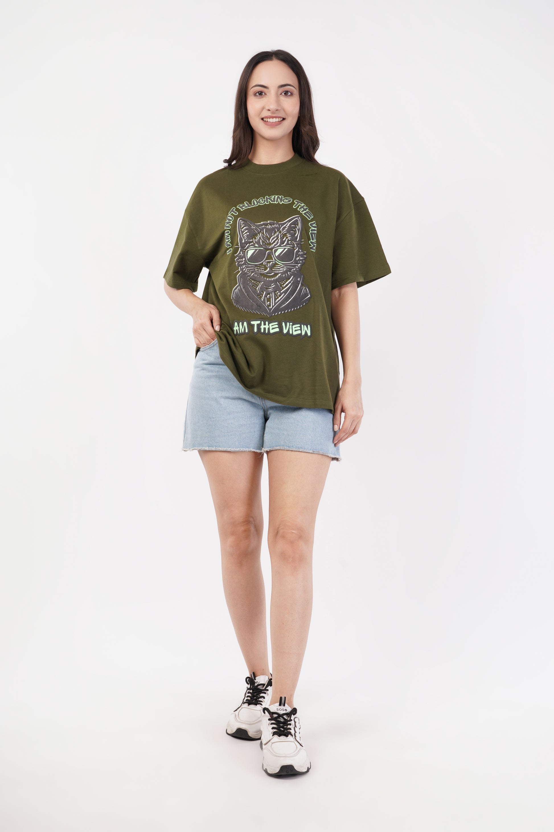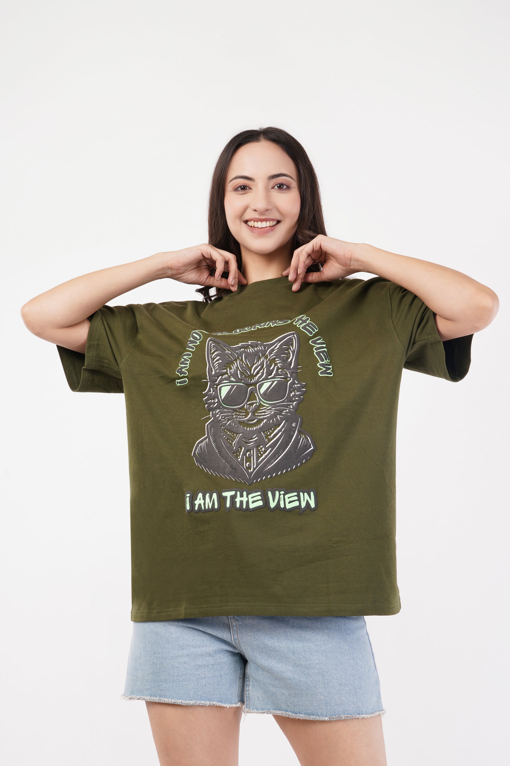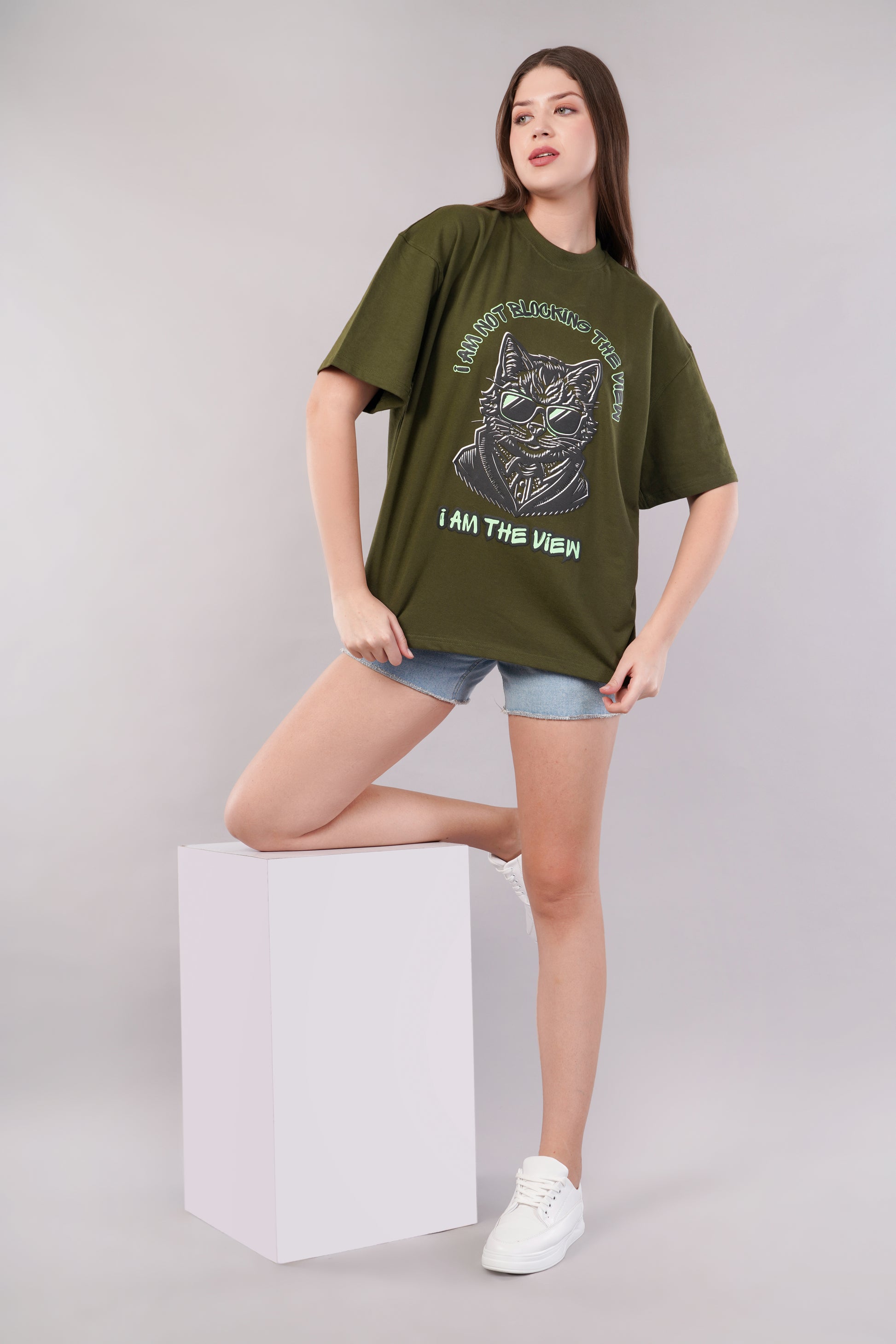 Unisex Puff Print "I am not blocking the view, I am the view" Olive Green Oversized T-Shirt
