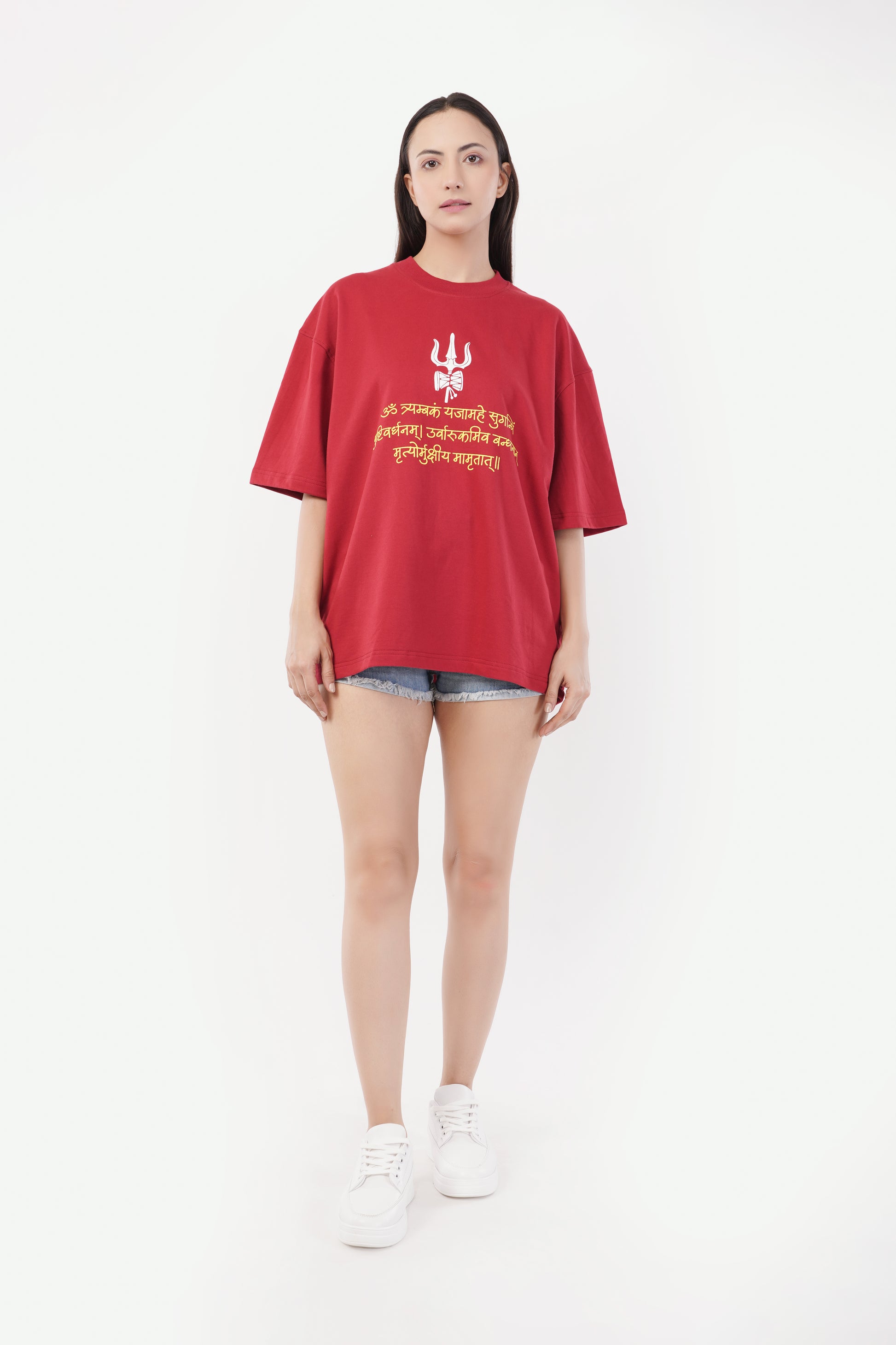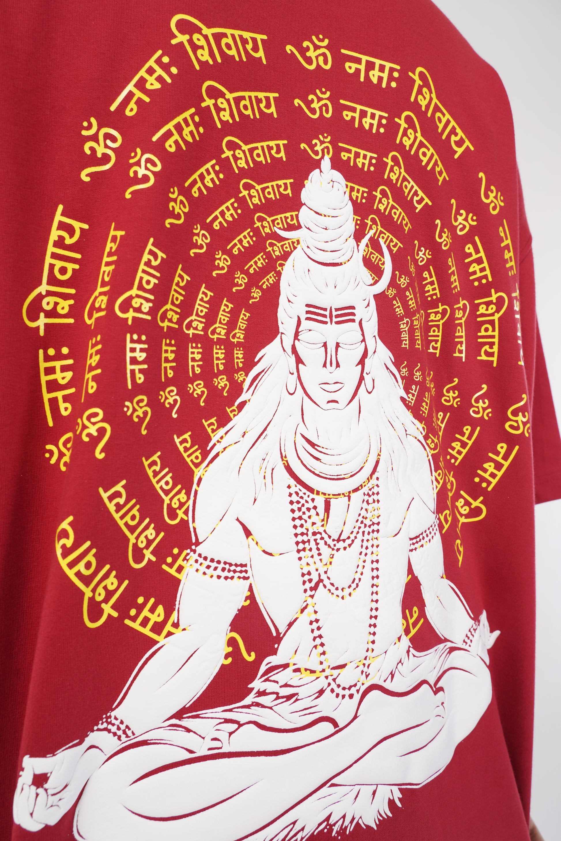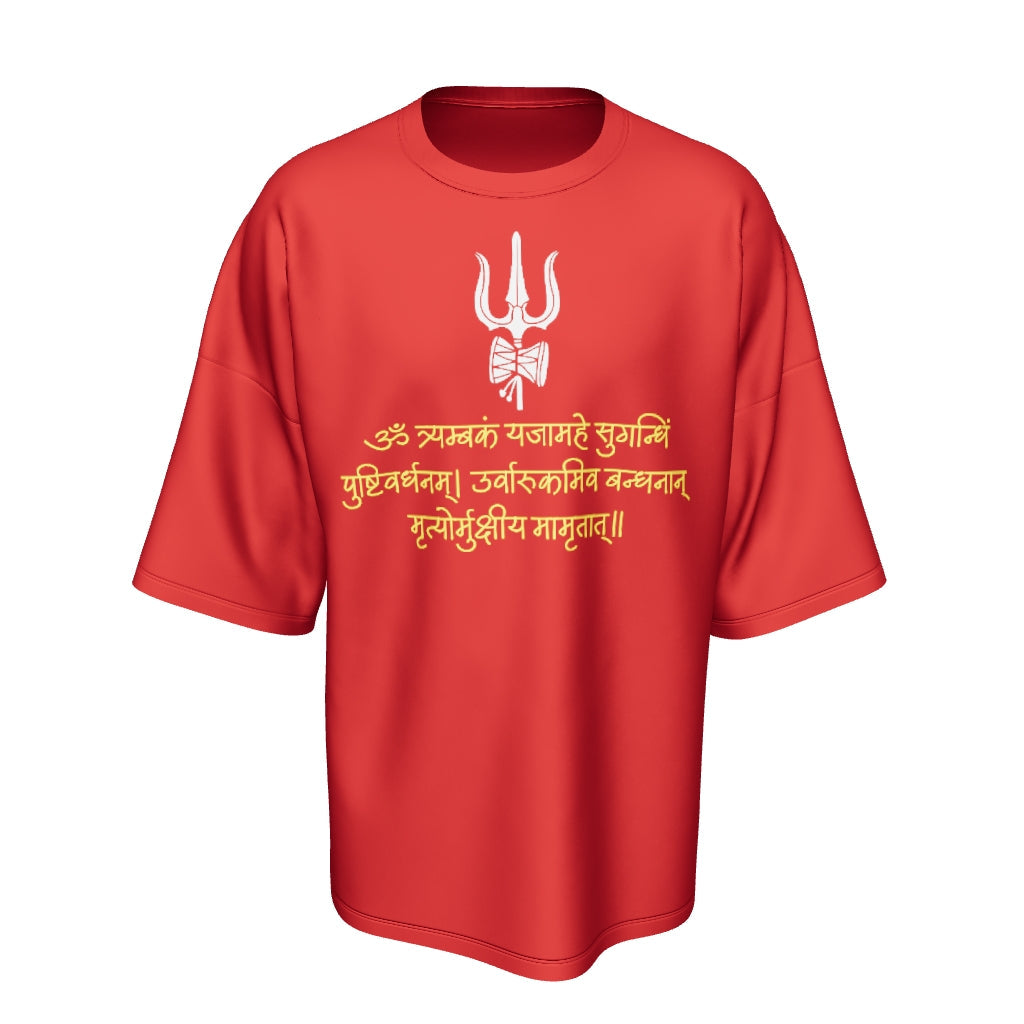 FROM THE FRONT, THE MINIMAL YET POWERFUL DESIGN KEEPS IT CLEAN, WITH A STRUCTURED SILHOUETTE THAT FLATTERS ALL BODY TYPES. THE BACK SHOWCASES A SUBTLE PUFFED TEXTURE OF LORD SHIVA WITH "OM NAMAH SHIVAYA" CHANTS AT THE BACK AND THE SHIV TRISHUL AND MAHA MRITYUMJAYA MANTRA IN THE FRONT WHICH ADDS DIMENSION AND A TOUCH OF DISTINCTION TO YOUR LOOK. PERFECT FOR THOSE WHO LOVE TO COMBINE COMFORT AND TRENDSETTING FASHION, THIS T-SHIRT IS THE ULTIMATE ADDITION TO YOUR WARDROBE.