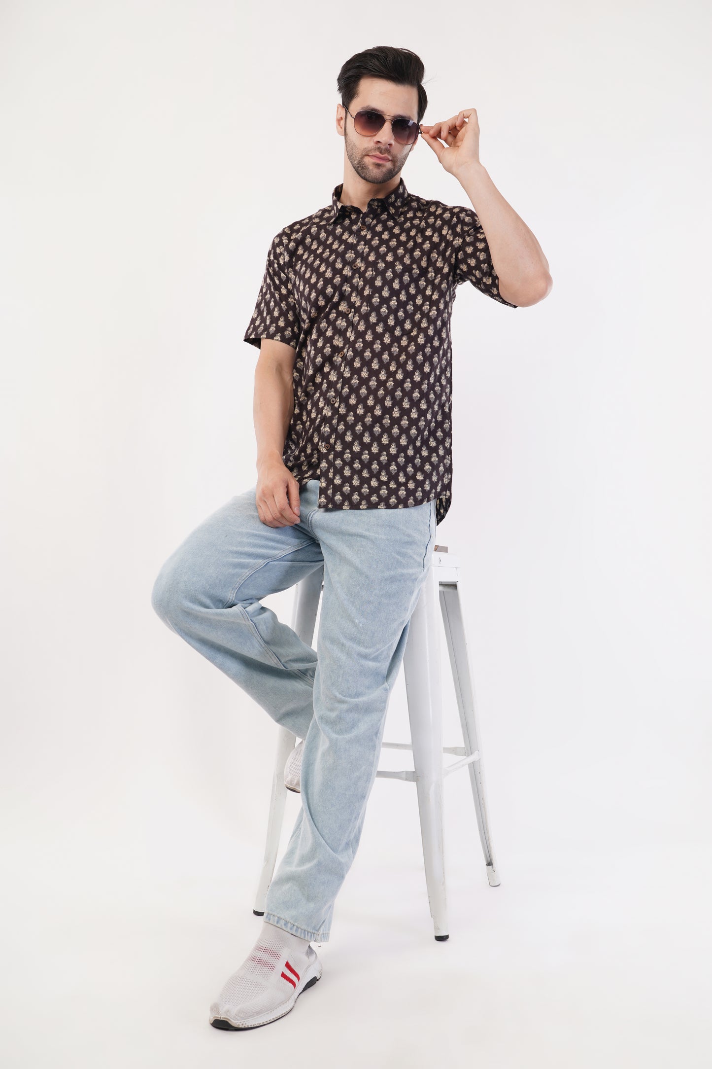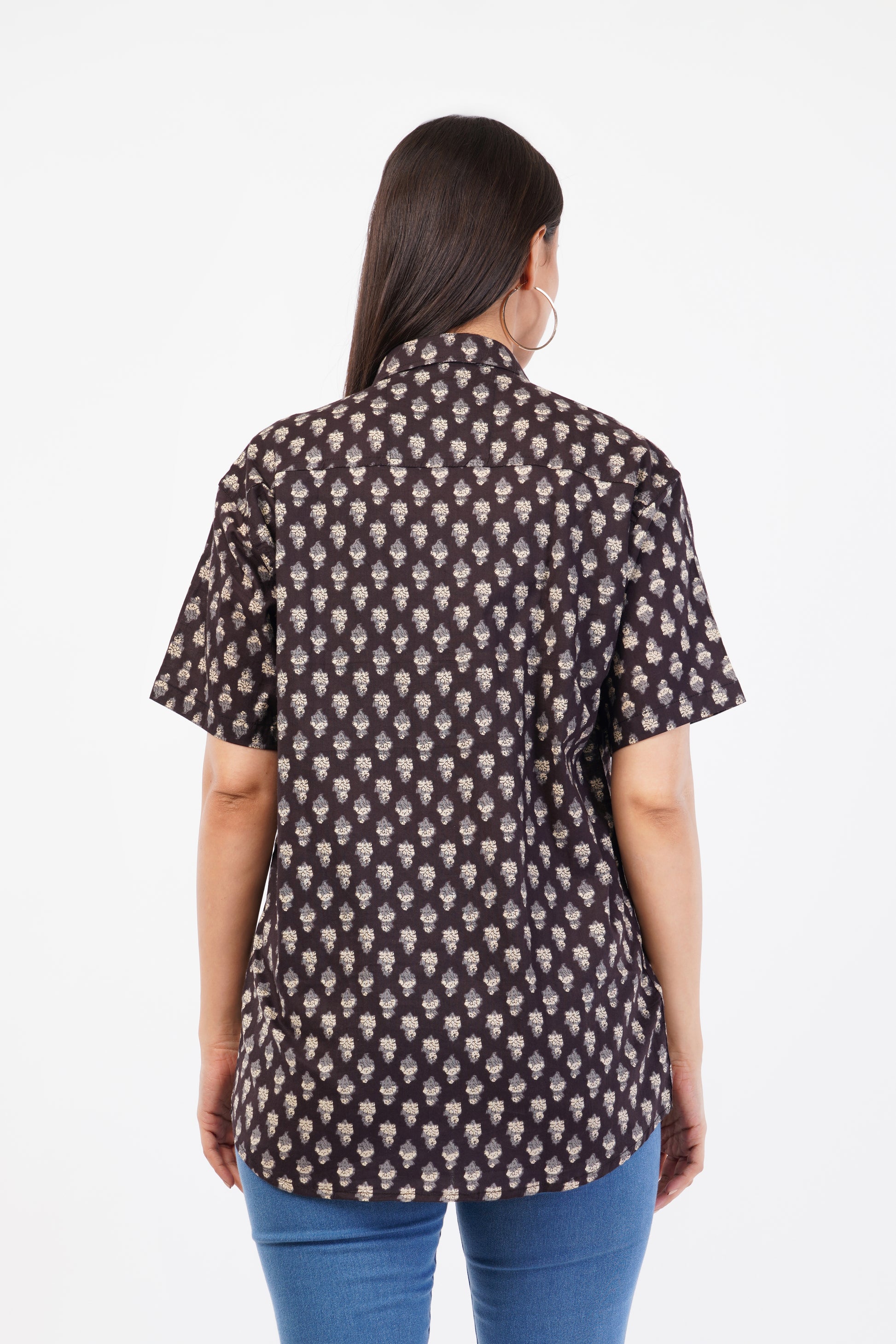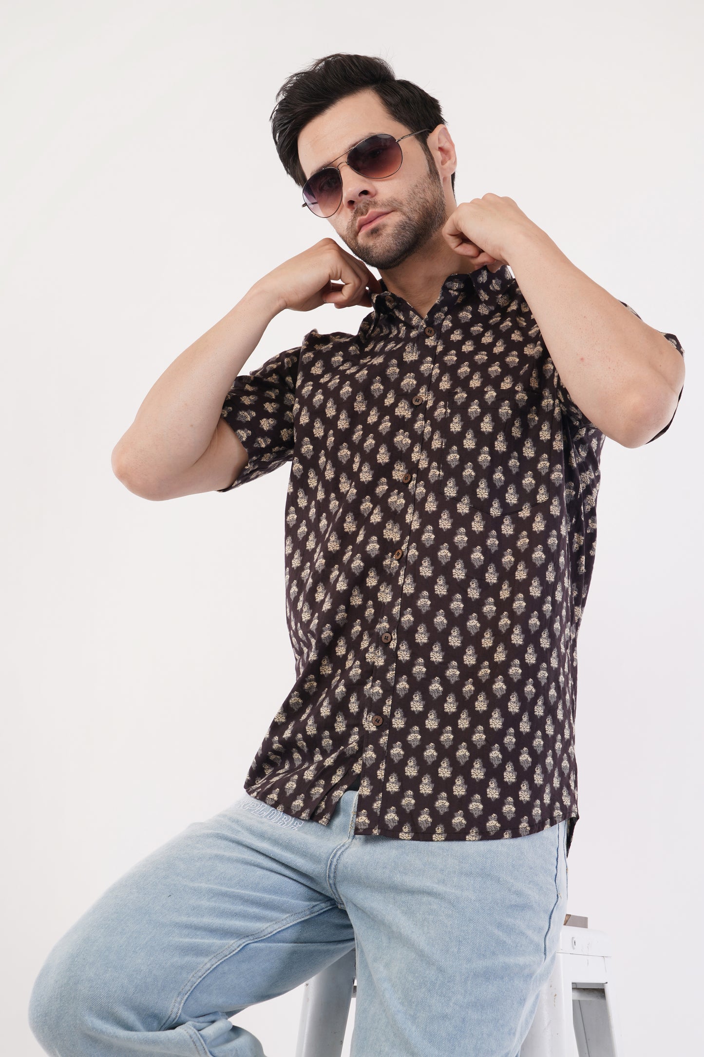 DISCOVER THE ESSENCE OF TRADITION AND STYLE WITH CLOVEIFY'S SANGANERI SHIRTS, METICULOUSLY HANDCRAFTED BY SKILLED ARTISANS FROM JAIPUR, RAJASTHAN. THIS 100% PURE COTTON BROWN SANGANERI SHIRT WITH SMALL WHITE PATTERN IS MADE FROM LIGHTWEIGHT 140 GSM COTTON, THESE SHIRTS FEATURE INTRICATE HAND-BLOCK PRINTS THAT CELEBRATE THE RICH HERITAGE OF SANGANERI CRAFTSMANSHIP.